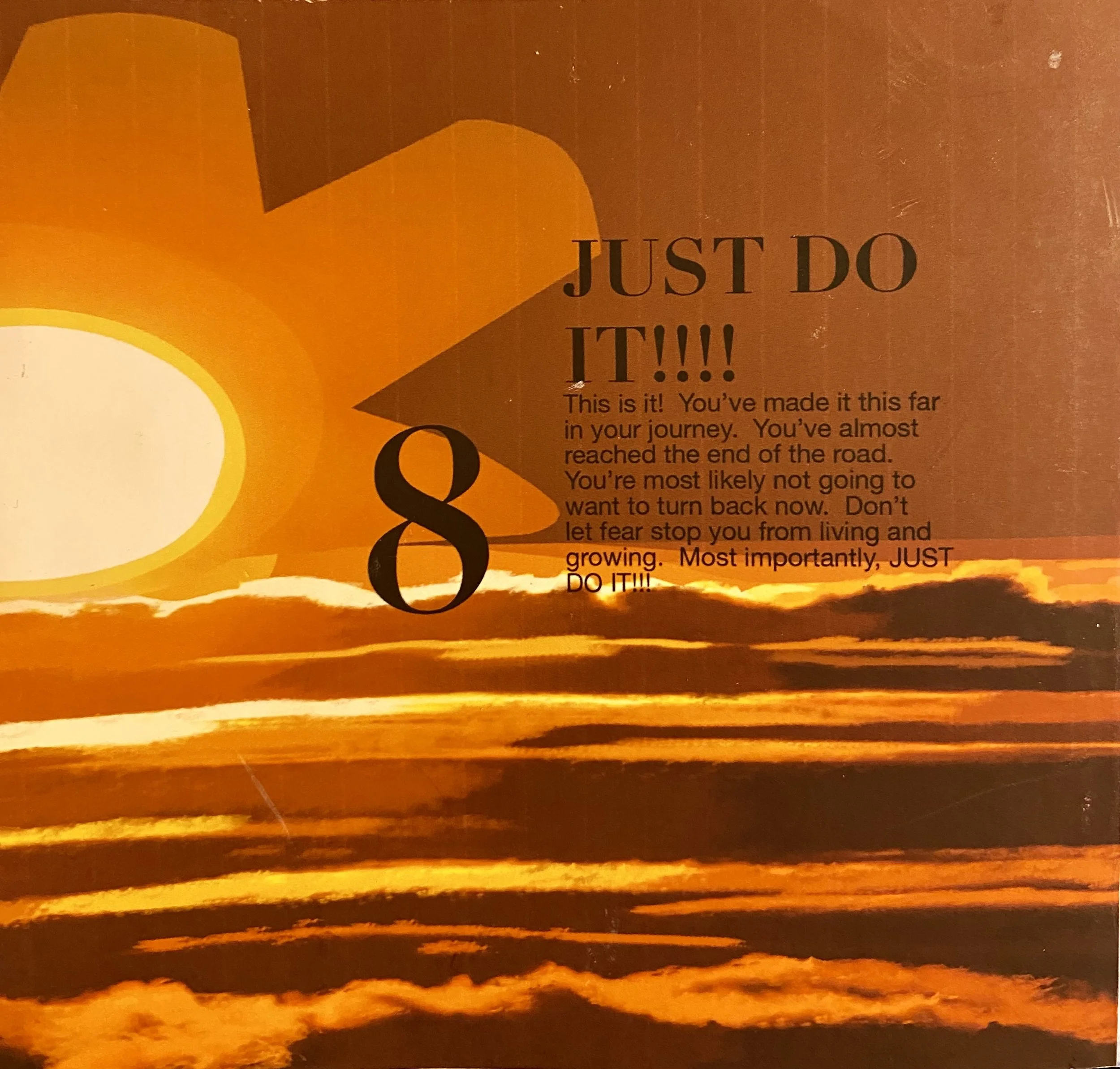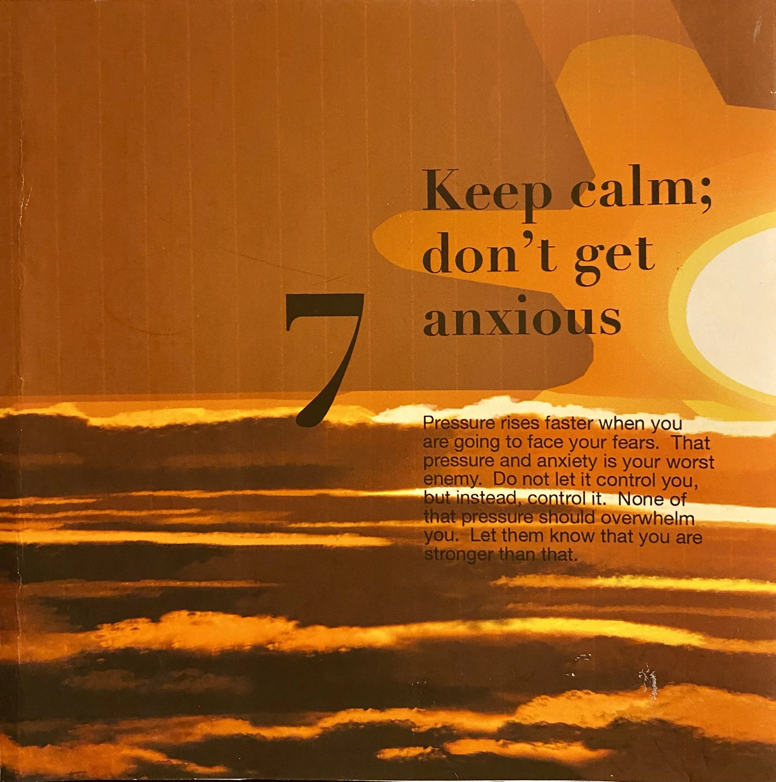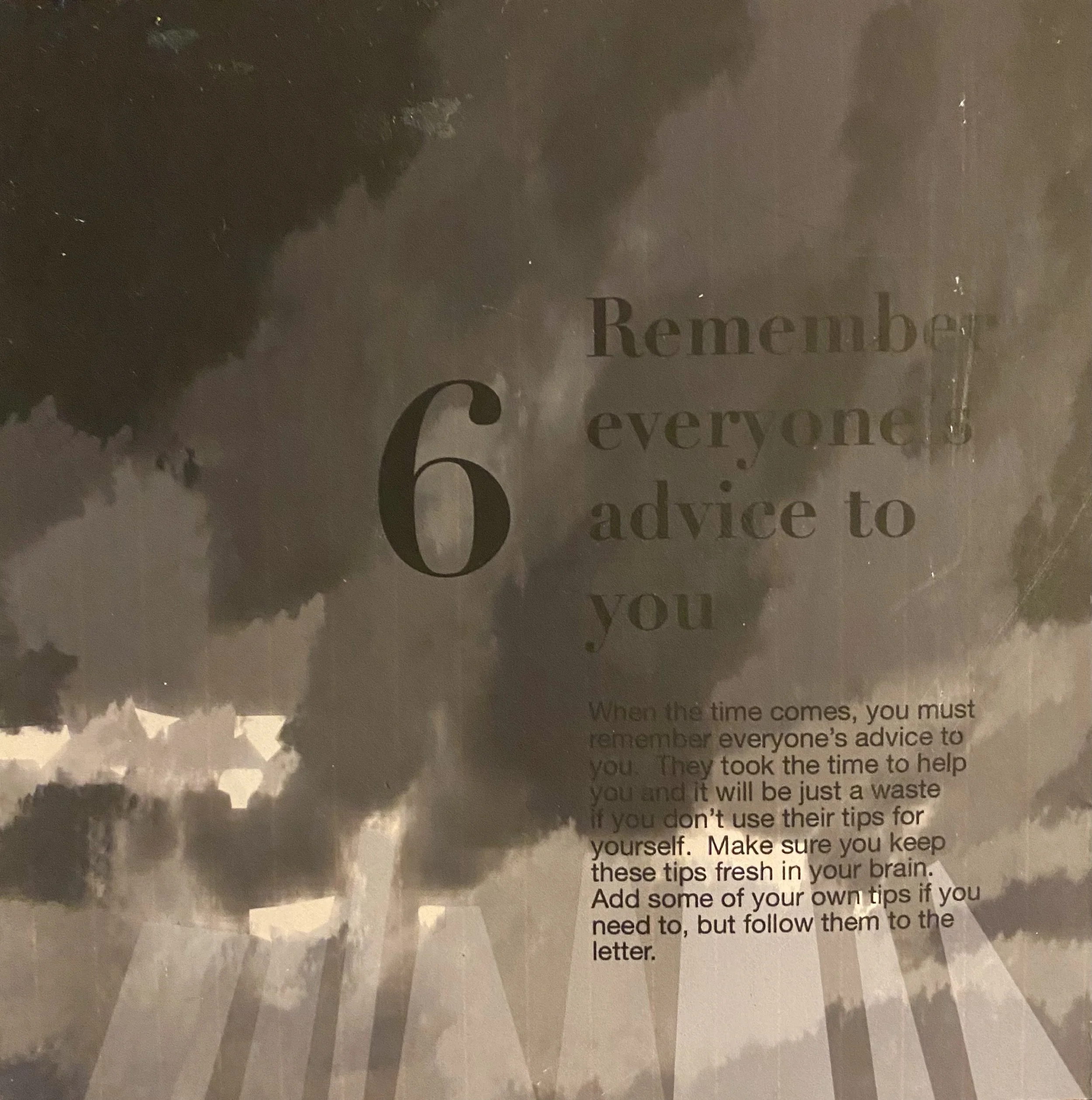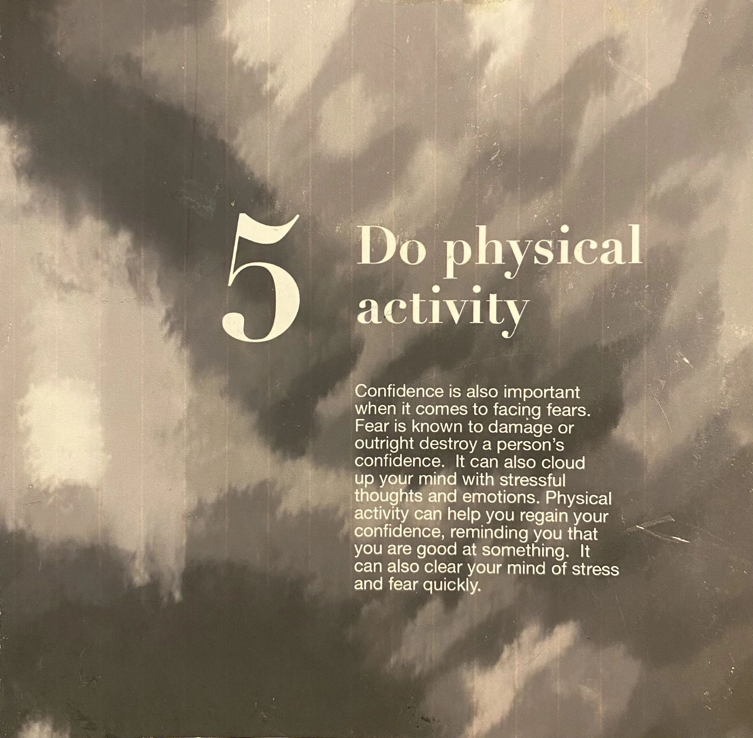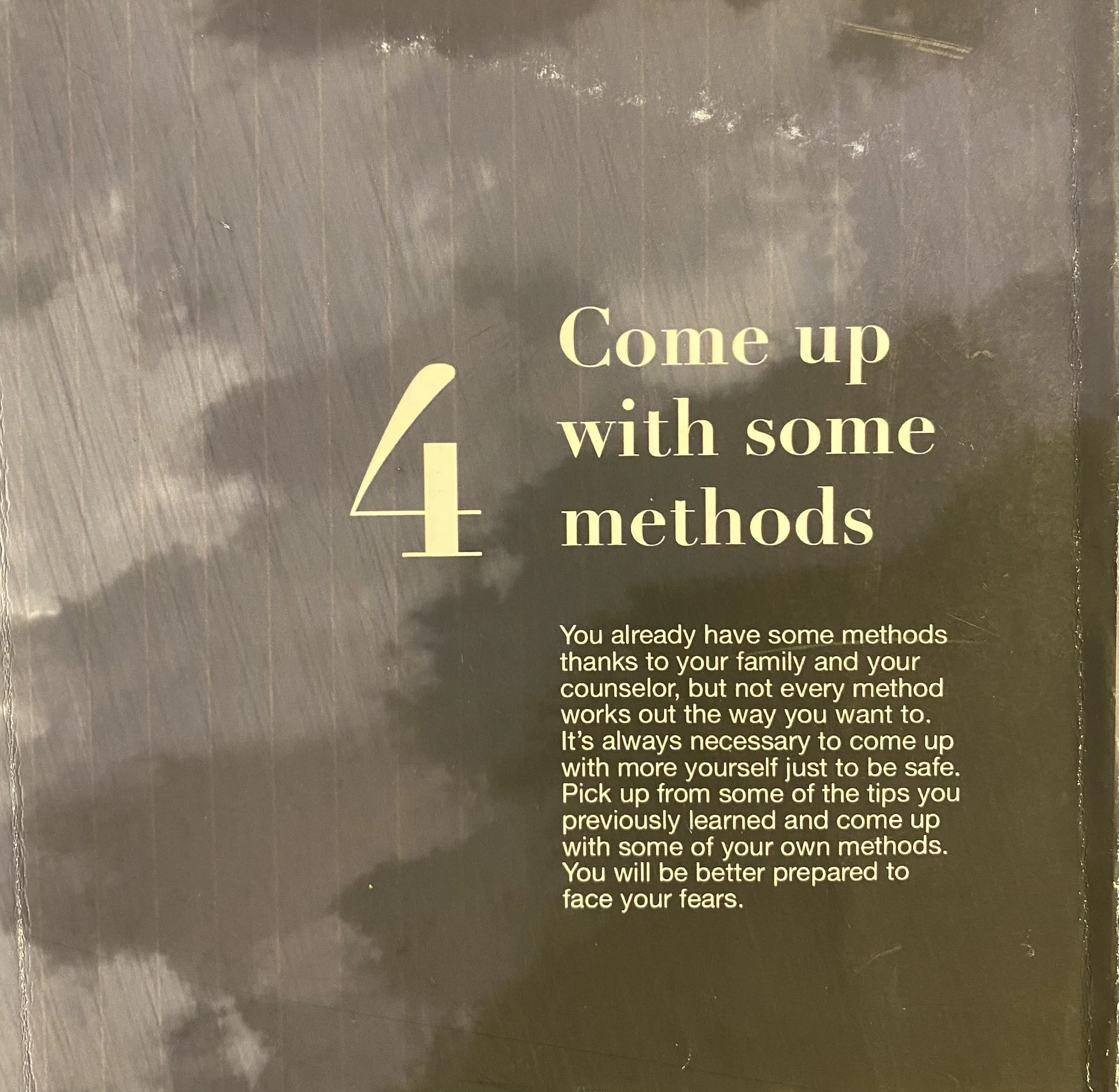 The accordion book has a total of ten steps for combatting anxiety. Each step contains a brief description that goes further into detail. I then decided to add the weather as a background to visualize the process of fighting anxiety. For example, the first page has a thunderstorm sky to symbolize how insecure you are at the start. The sky becomes clear and brighter as you progress to showcase your growing confidence. In the last step, the sky is clear, and the sun rises behind the clouds to show that you completed your process of gaining confidence.