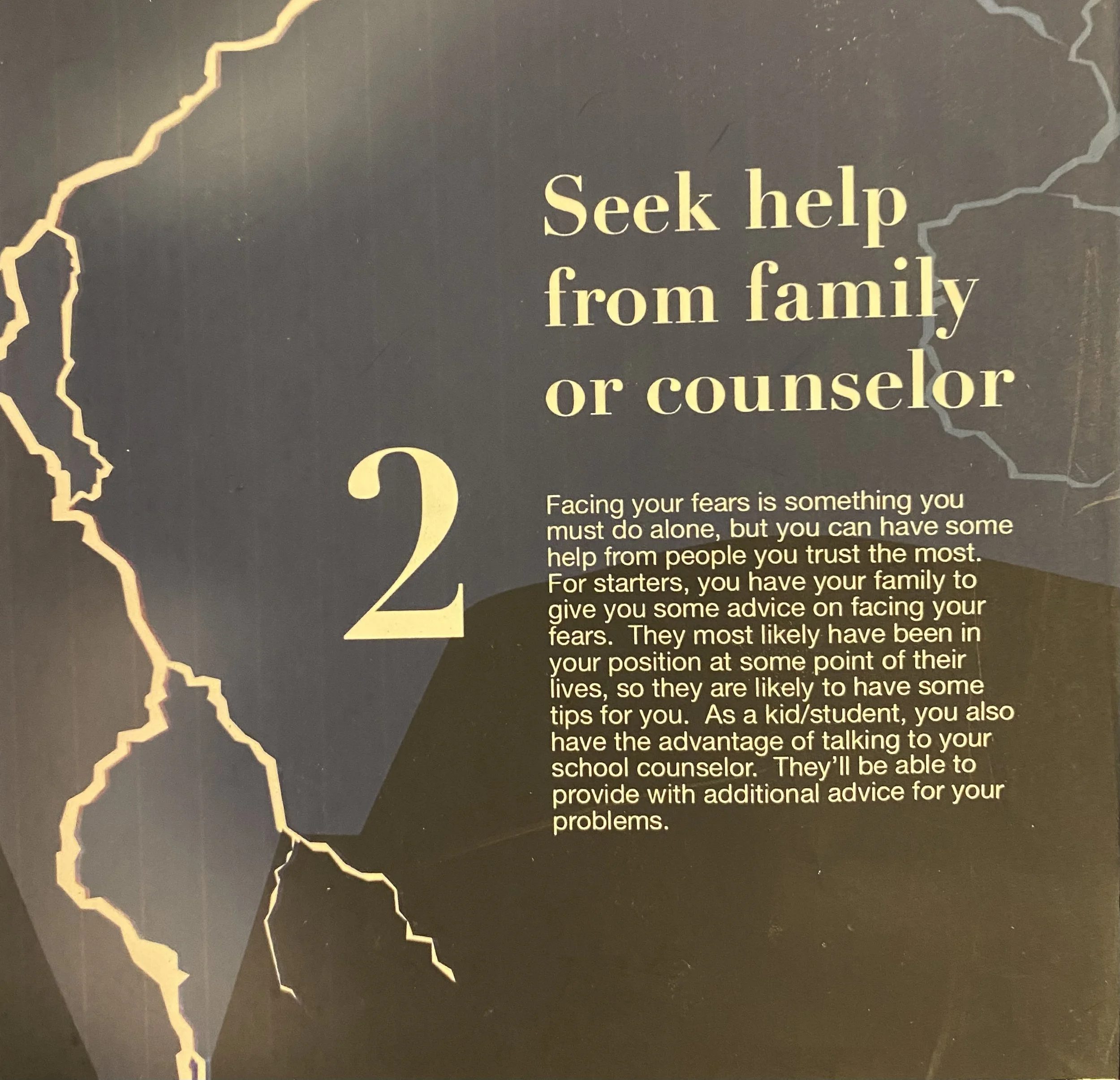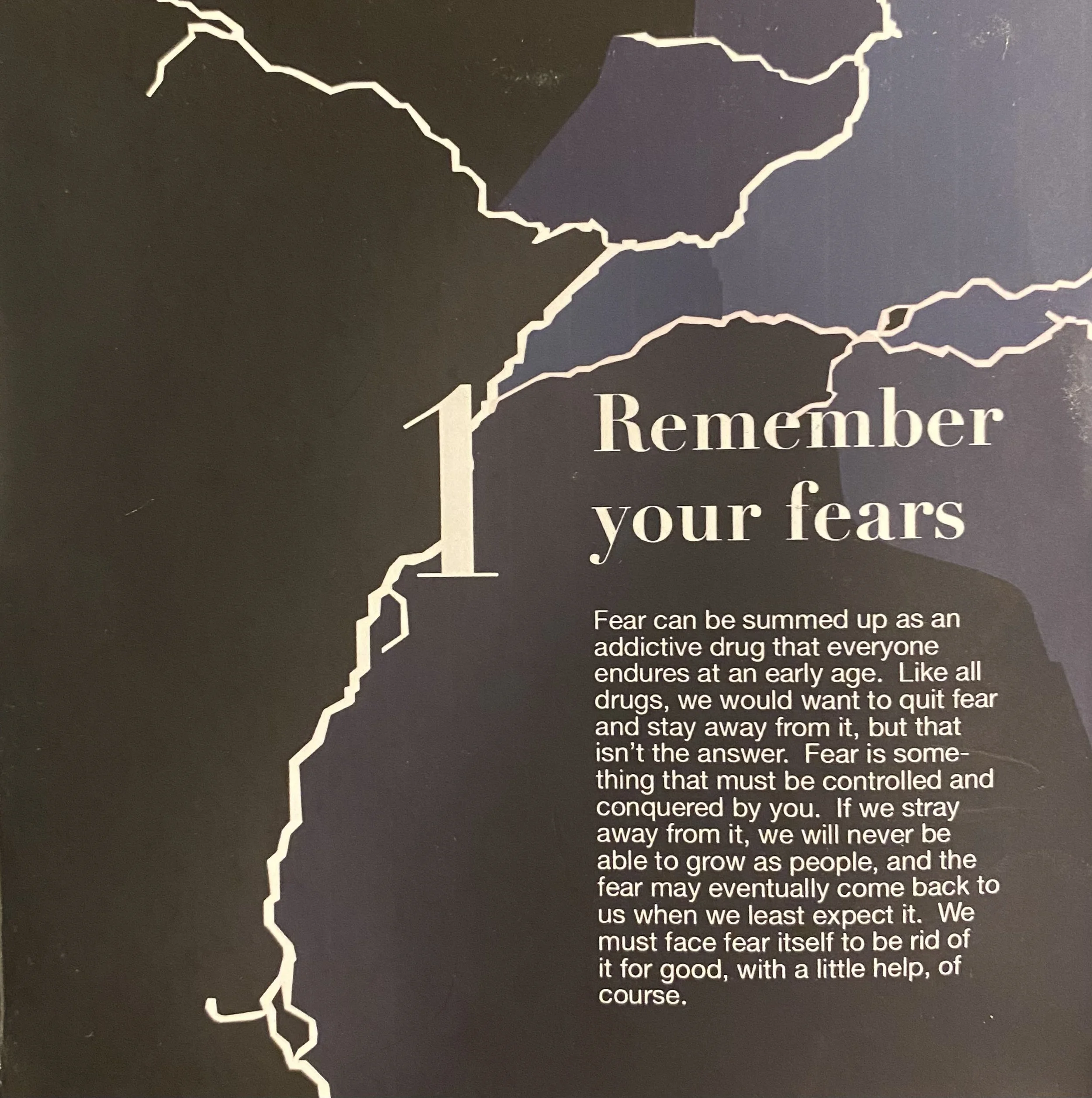 This page focuses on another project I made at Rutgers: the accordion book How to Face Your Fears. The book was created for people who struggle with anxiety and insecurity. This project was inspired by my own experiences with those emotions during a time when I was still trying to figure out my own identity. I made this to explain my advice on how to deal with these emotions and gain more confidence.